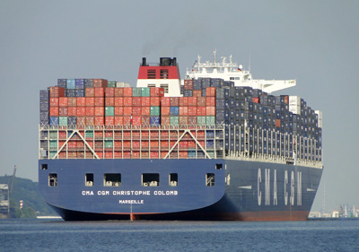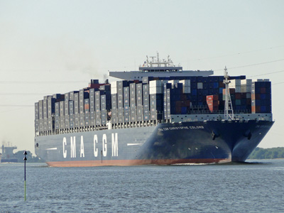 "CMA CGM Christophe Colomb" Passiert Lühe am 13.07.2010 Kurs Hamburg.Der Frachter bringt es auf eine Tragfähigkeit von 157.000 Tonnen. Der 365 Meter lange und 51 Meter breite Containerriese kann 13 800 Container laden.